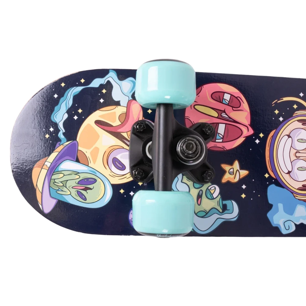 Яркий дизайн делает эту модель неповторимой: нижняя часть деки украшена крутым принтом в голубых тонах с изображением космоса и инопланетян. Это не просто товары для спорта, это - произведение искусства на колесах.